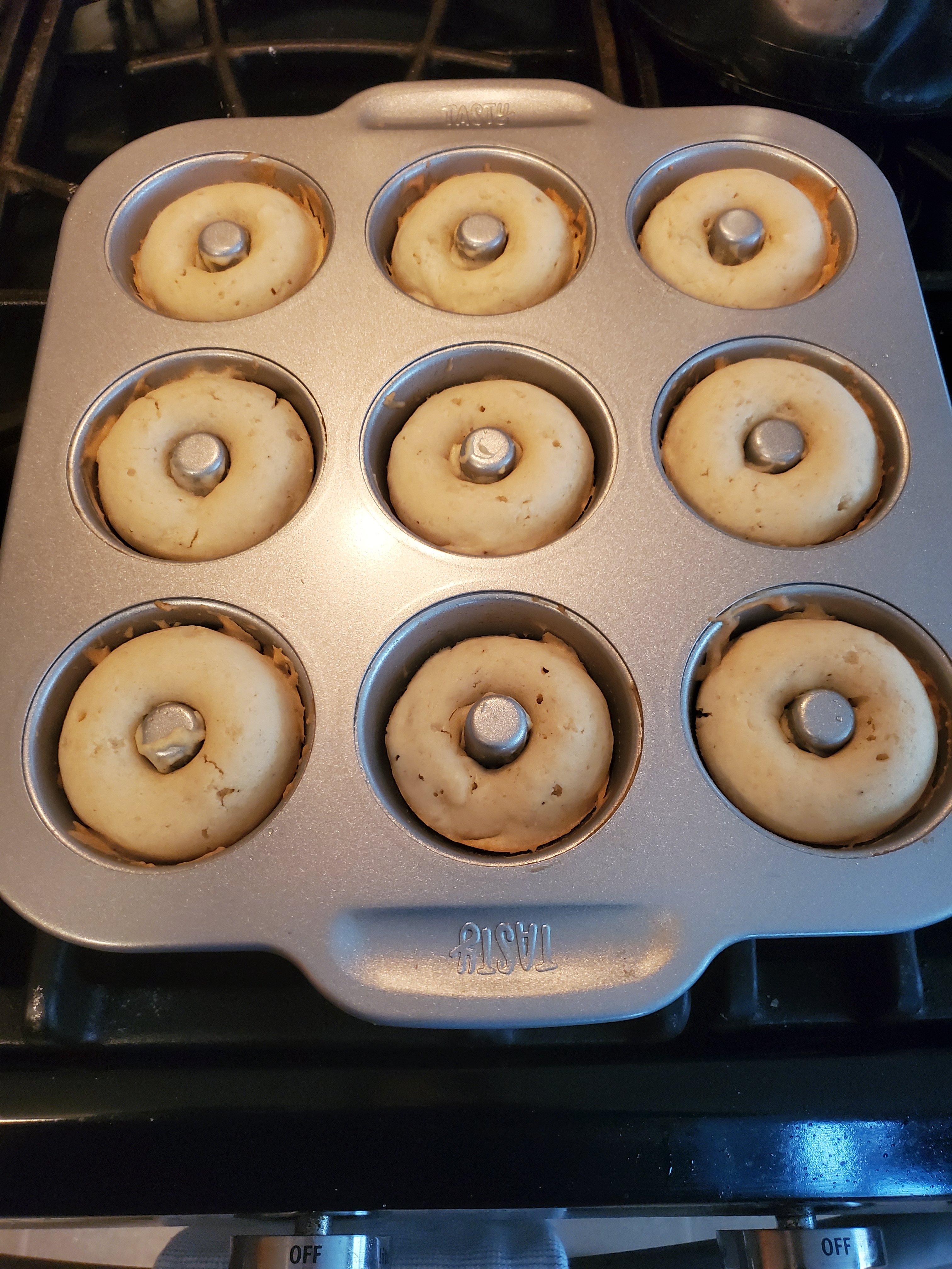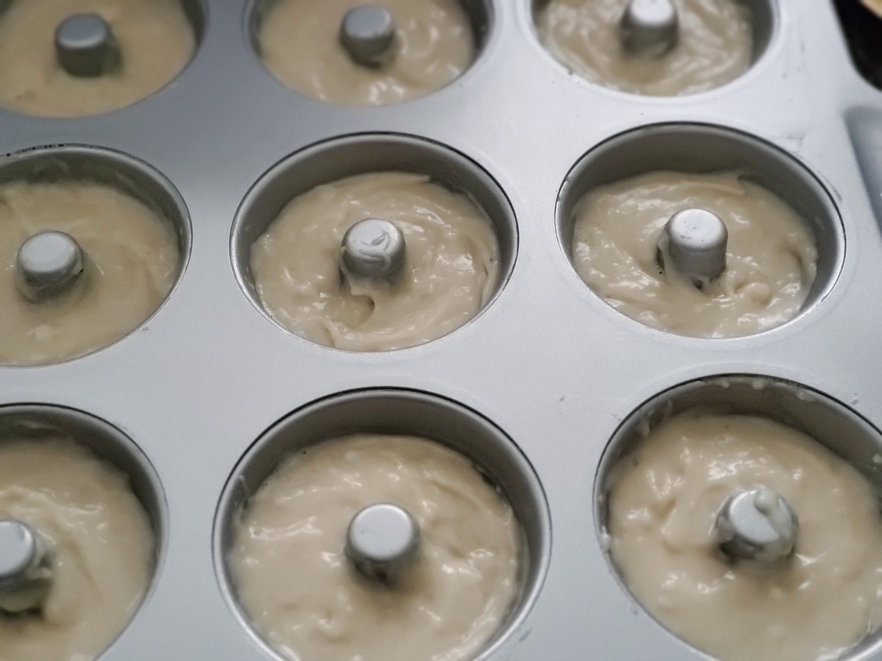 Preheat oven to 375 degrees. Spray donut pan with coconut spray or canola oil spray, then set aside.